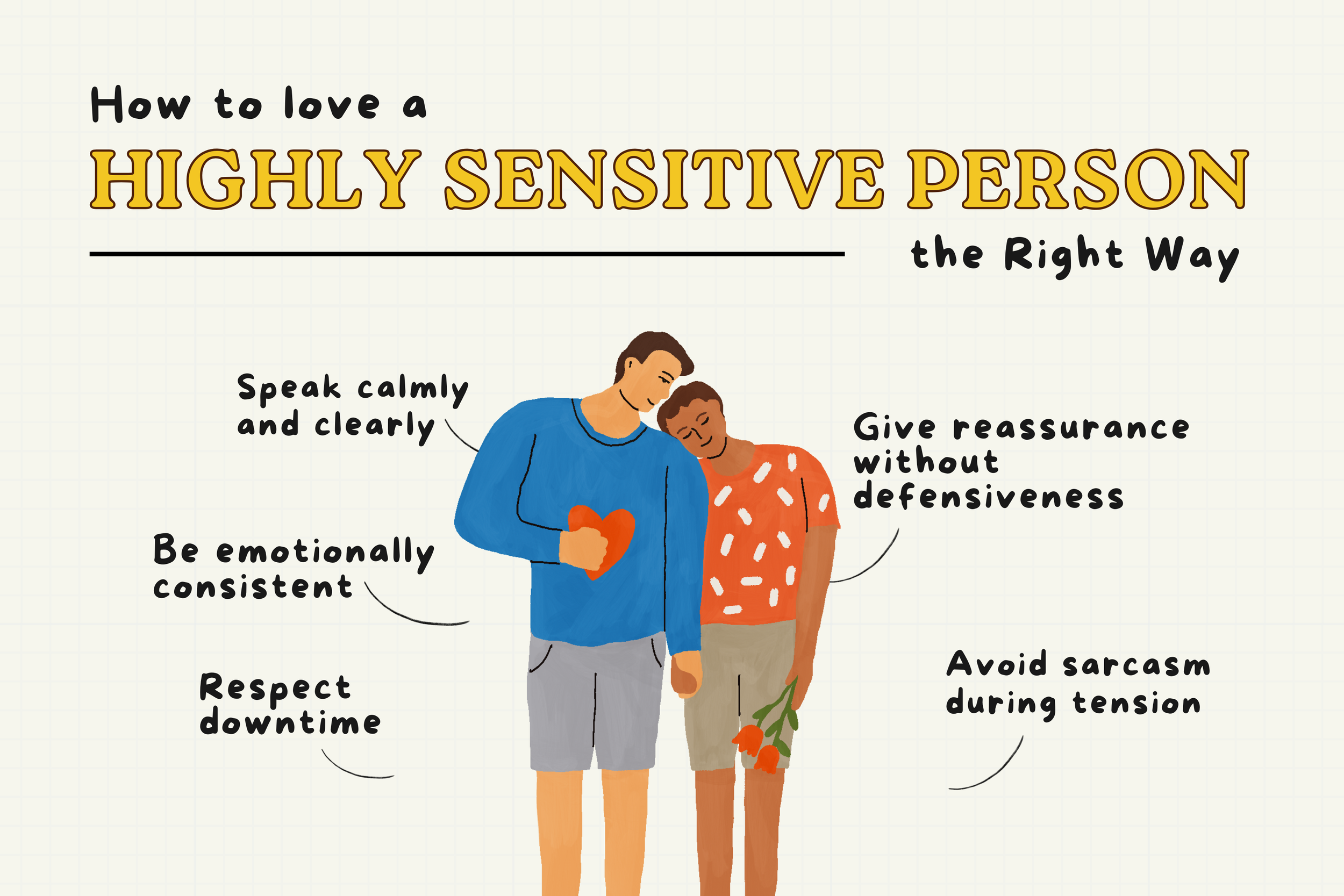 Kindness is also essential to a relationship with an HSP. Words, tone, and attitude carry meaning for HSPs. Casual negative comments or harsh voice tones are felt more intensely, whereas thoughtful communication prompts safety and connection. Acts of thoughtfulness, choosing words with kindness and care, and showing up with warmth can support an HS{ feeling valued and emotionally secure.